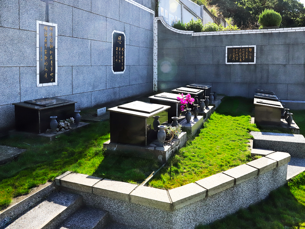 伉儷戶外立墓,墓碑整體以黑花崗面板砌成,大方氣質,沈穩內斂。 四周遍佈清新綠草,抬頭即是藍天白雲,遠眺淡水河出海口美景,前方即是藍天白雲映襯遠山綠茵,如臨永恆國度。